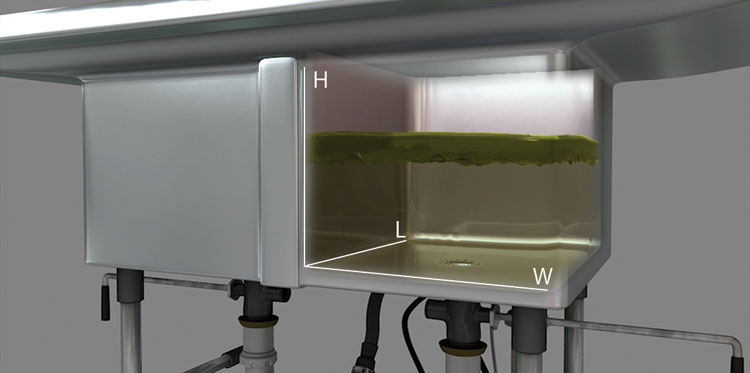 - Maximum flow rate - Calculated based on each of the sink compartment dimensions and the number of additional fixtures (i.e. mop sink, hand sink, pre-rinse sink, etc.) connected to the grease interceptor.